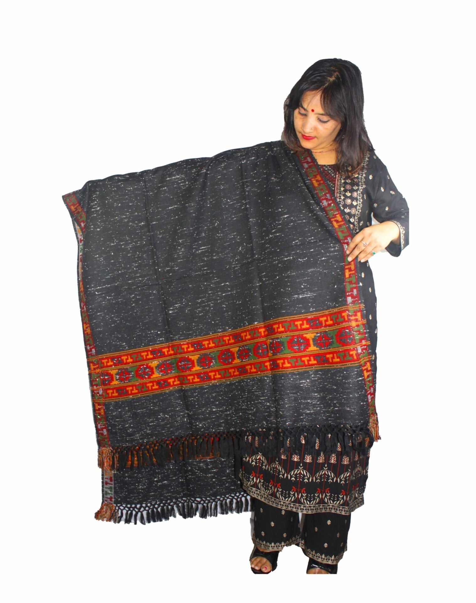 kullu pashmina shawl online PURE YAK WOOL KULLU SHAWL BLACK WITH WHITE DOTS